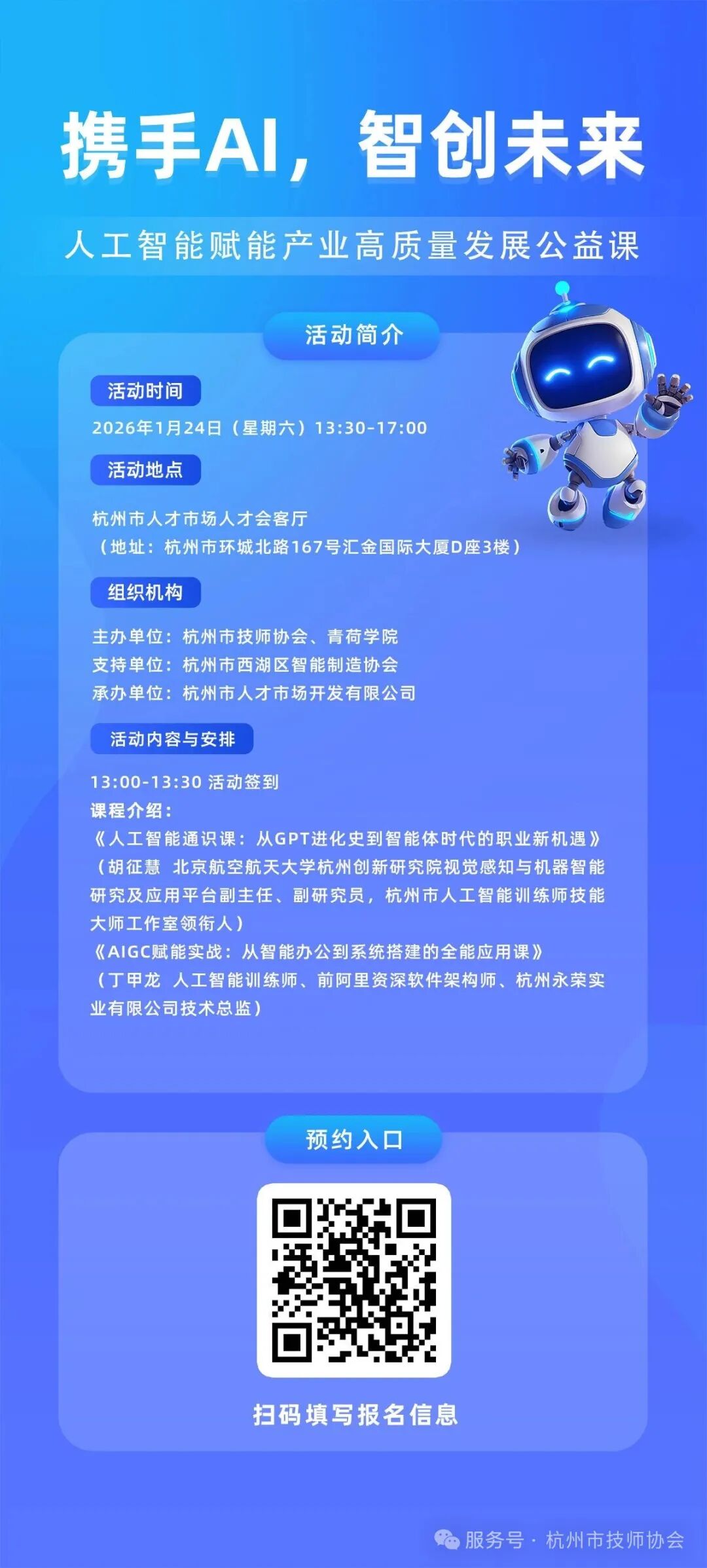为深入贯彻落实杭州市关于推动人工智能产业创新发展的决策部署,促进人工智能技术与实体经济深度融合,助力企业智能化转型与高质量发展,杭州市技师协会联合青荷学院共同策划举办“携手AI,智创未来”人工智能公益课。